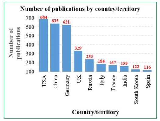 在理論研究方面,卡塔爾大學工程學院學者Ahmad K. Sleiti在2022年通過研究發(fā)現(xiàn),數(shù)字孿生技術(shù)在能源行業(yè)中的研究成果依舊集中在經(jīng)濟發(fā)達地區(qū),其中歐盟地區(qū)發(fā)表成果最多。據(jù)下列圖表顯示,歐盟地區(qū)(德國、意大利、法國、西班牙)研究成果整體數(shù)量高于美國、中國、英國以及俄羅斯國家等國家,占據(jù)全球第一位。