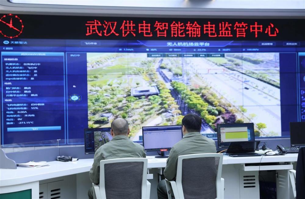 10月23日,武漢漢口江灘,一架白色的無人機(jī)在高空穿梭,機(jī)頭對準(zhǔn)濱江區(qū)內(nèi)的國家電網(wǎng)線路來回進(jìn)行掃描、拍攝。與此同時,距離巡檢現(xiàn)場數(shù)公里外的國網(wǎng)武漢供電公司的巨型屏幕上,無人機(jī)的超高清畫面即時顯示。