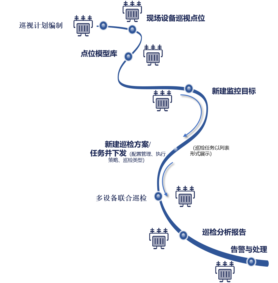 同時,針對變電站內(nèi)攝像機、機器人、無人機、在線監(jiān)測等多種感知及智能巡視設(shè)備間缺乏聯(lián)動機制現(xiàn)象,江行智能開發(fā)變電遠程智能巡視系統(tǒng),可將上述多種智能巡視設(shè)備納入系統(tǒng)管控,并設(shè)計聯(lián)合巡檢策略,最大程度挖掘智能設(shè)備價值,提升設(shè)備利用率及巡視作業(yè)智能化水平。