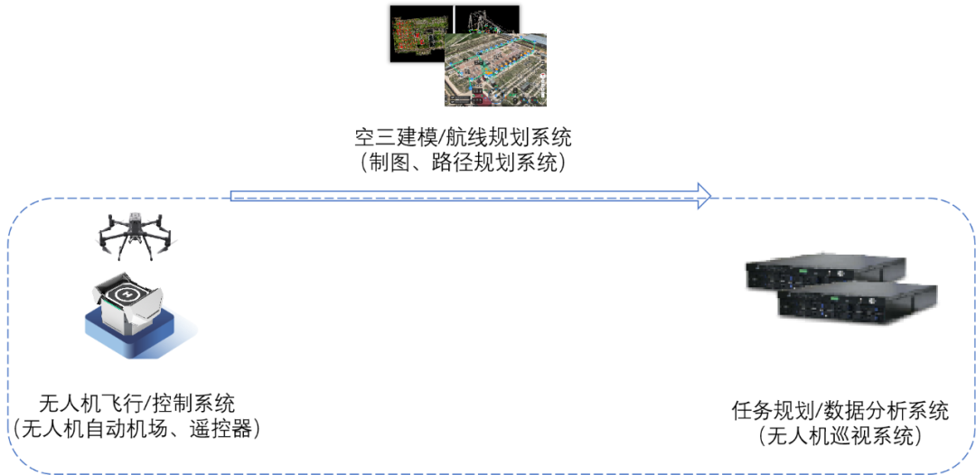 江行智能無人機智能巡視系統(tǒng)主要由無人機飛行/控制系統(tǒng)、空三建模/航線規(guī)劃系統(tǒng)、任務規(guī)劃/數(shù)據(jù)分析系統(tǒng)三大部分組成,通過采集現(xiàn)場圖片、建立現(xiàn)場模型、規(guī)劃巡視航線、配置算法/點位、制定飛行計劃,進而定時下發(fā)飛行任務,完成數(shù)據(jù)分析、報告、消缺等任務。