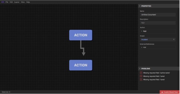 2.攻擊鏈建模編輯器:在瀏覽器中運(yùn)行,幾分鐘內(nèi)便可完成攻擊流程的創(chuàng)建。該編輯器提供了一個(gè)工作空間,用戶可以輸入攻擊行動(dòng)及其他背景信息,通過(guò)繪制箭頭,用戶可將這些信息編織成一個(gè)攻擊流程,明確展示事件或活動(dòng)中觀察到的攻擊技術(shù)執(zhí)行順序。