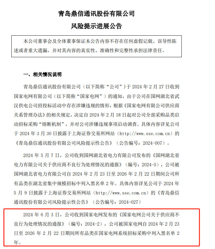 鼎信通訊6月4日晚間公告,6月3日,公司收到國家電網(wǎng)發(fā)布的《國家電網(wǎng)公司關(guān)于供應(yīng)商不良行為處理情況的通報(bào)》,公司被國家電網(wǎng)自2024年2月23日至2026年2月22日期間所有品類在國家電網(wǎng)系統(tǒng)招標(biāo)采購中列入黑名單2年。