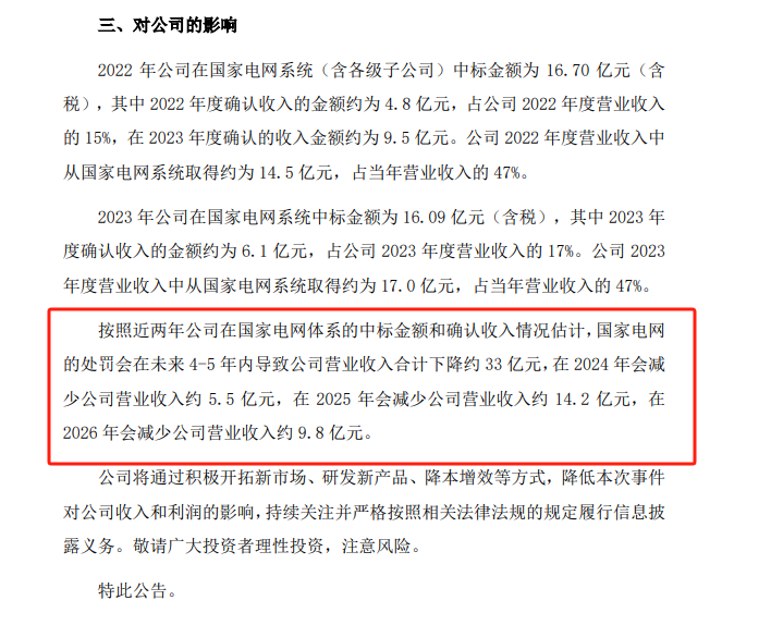 公告顯示,2022年鼎信通訊在國家電網(wǎng)系統(tǒng)(含各級(jí)子公司)中標(biāo)金額為16.7億元(含稅),其中2022年度確認(rèn)收入的金額約為4.8億元,占公司2022年度營業(yè)收入的15%。公司2022年度營業(yè)收入中,從國家電網(wǎng)系統(tǒng)取得約14.5億元,占當(dāng)年?duì)I業(yè)收入的47%。2023年,鼎信通訊在國家電網(wǎng)系統(tǒng)中標(biāo)金額為16.09億元(含稅),其中2023年度確認(rèn)收入的金額約為6.1億元,占公司2023年度營業(yè)收入的17%。公司2023年度營業(yè)收入中,從國家電網(wǎng)系統(tǒng)取得約17億元,占當(dāng)年?duì)I業(yè)收入的47%。按照近兩年公司在國家電網(wǎng)體系的中標(biāo)金額和確認(rèn)收入情況估計(jì),國家電網(wǎng)的處罰會(huì)在未來4-5年內(nèi)導(dǎo)致公司營業(yè)收入合計(jì)下降約33億元,在2024年會(huì)減少公司營業(yè)收入約5.5億元,在2025年會(huì)減少公司營業(yè)收入約14.2億元,在2026年會(huì)減少公司營業(yè)收入約9.8億元。