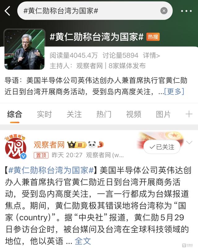 6月6日晚,#黃仁勛稱臺灣為國家#詞條一度登上微博熱搜,引發(fā)關(guān)注。