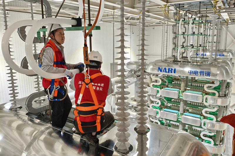 ▲國網電科院(南瑞集團)員工在渝北換流站開展雙極低端換流閥帶電前專項檢查