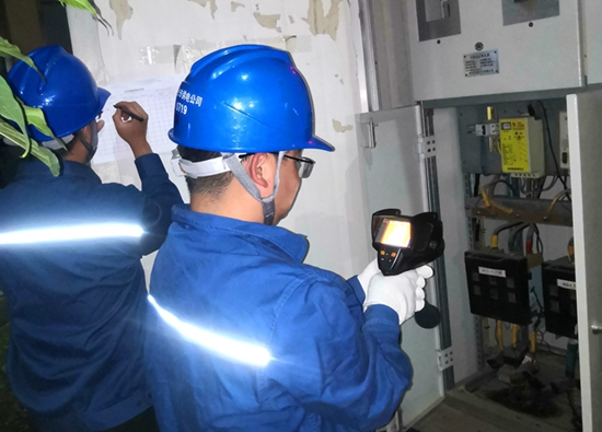 中國電力網(wǎng)訊 6月22日晚,在濰坊壽光市張建橋社區(qū),國網(wǎng)壽光市供電公司城區(qū)供電中心工作人員對高低壓線路設(shè)備進(jìn)行夜巡,用紅外測溫設(shè)備對電纜頭、隔離開關(guān)等關(guān)鍵部位進(jìn)行測溫,及時發(fā)現(xiàn)并消除設(shè)備運(yùn)行缺陷,保障轄區(qū)居民夏季安全可靠用電。