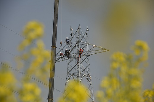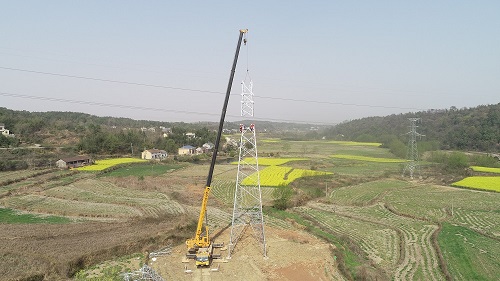 中國(guó)電力網(wǎng)訊(通訊員鄒小民、郭暉、朱景明)3月15日,在湖北宜都市枝城鎮(zhèn)何陽(yáng)店村宜昌-荊州江南220千伏電網(wǎng)優(yōu)化工程53號(hào)桿塔施工場(chǎng),國(guó)網(wǎng)湖北送變電公司施工人員吊裝鐵塔,加快推進(jìn)宜昌-荊州江南220千伏電網(wǎng)優(yōu)化工程建設(shè),工程投產(chǎn)后將增容電力“大動(dòng)脈”,提升輸送能力?! ?/p>