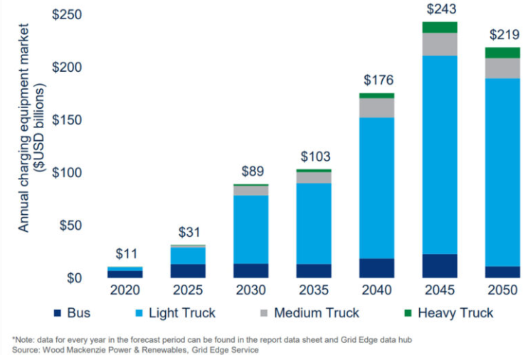 “政府資金和零排放車輛法規(guī)是迄今為止在每個(gè)地區(qū)采用商用電動(dòng)汽車(EV)的強(qiáng)大驅(qū)動(dòng)力,因此減少了商用電動(dòng)汽車采用的主要障礙,即成本。這項(xiàng)政策支持將看到到2045年,電動(dòng)巴士和電動(dòng)卡車充電站的年度市場價(jià)值將突破2000億美元大關(guān)。”