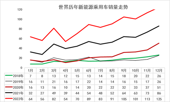 2022年世界新能源車起步較強(qiáng),1-3月基本實(shí)現(xiàn)強(qiáng)勢(shì)高增長(zhǎng),4-5月的新能源走勢(shì)放緩并劇烈下滑,6-12月世界新能源銷量持續(xù)較強(qiáng)增長(zhǎng)。