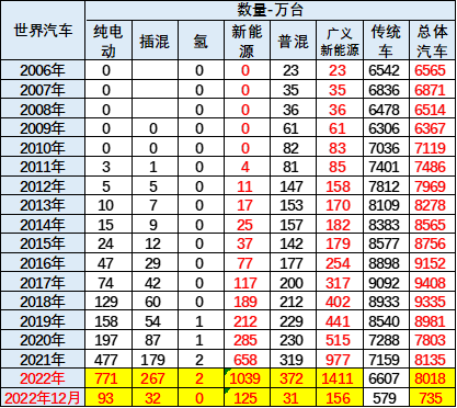 2012年世界廣義新能源汽車158萬臺(tái),到2015年僅有179萬臺(tái),增長(zhǎng)緩慢。隨著2016年開始的新能源車加速發(fā)展,廣義新能源車2016年突破200萬臺(tái);2017年達(dá)到317萬臺(tái);2018年突破400萬臺(tái);2020年達(dá)到515萬臺(tái);2021年全年廣義新能源車977萬臺(tái),其中普通混合動(dòng)力達(dá)到319萬臺(tái);2022年1-12月的廣義新能源汽車銷量1411萬臺(tái),其中混合動(dòng)力達(dá)到372萬臺(tái),占比26%。
