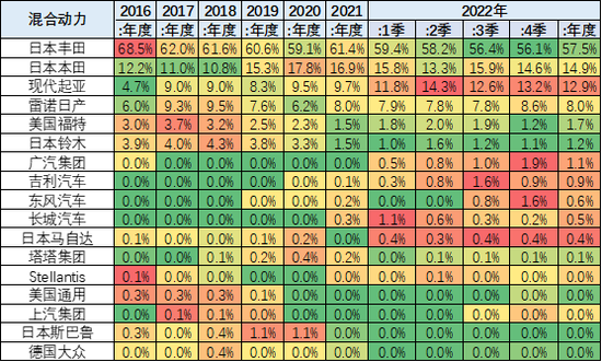 混合動(dòng)力市場(chǎng)是日韓有效的控制,豐田、本田、日產(chǎn)和現(xiàn)代的混動(dòng)表現(xiàn)很強(qiáng),占據(jù)93%。其他大部分企業(yè)的混動(dòng)份額均不超過1%。長(zhǎng)城在1季度的混動(dòng)市場(chǎng)份額表現(xiàn)較強(qiáng),也是產(chǎn)品突破的機(jī)遇。