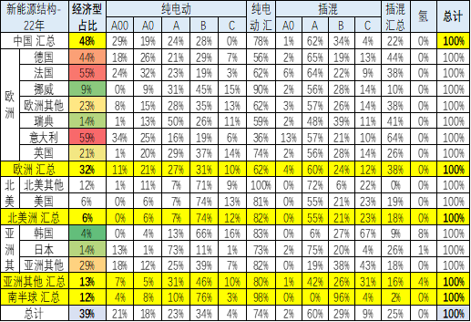 2022年的世界新能源車結(jié)構(gòu)是中國(guó)偏純電動(dòng)。歐洲主力國(guó)家市場(chǎng)插混較強(qiáng),歐洲市場(chǎng)結(jié)構(gòu)的純電與插混持平的特征明顯,挪威等非汽車生產(chǎn)國(guó)家的純電動(dòng)較強(qiáng)。