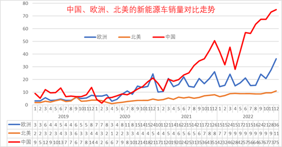 根據(jù)全國(guó)乘聯(lián)會(huì)數(shù)據(jù):中國(guó)2022年1-12月的銷量649萬臺(tái),大幅超越歐洲的247萬和北美洲的103萬的銷量,中國(guó)新能源車優(yōu)勢(shì)明顯。