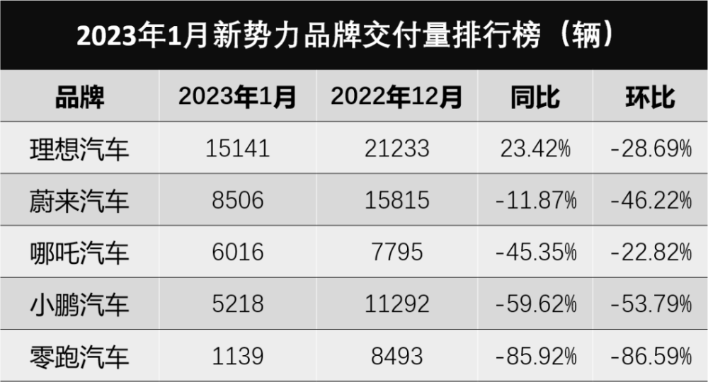 或許是春節(jié)前后家庭用車需求的刺激,理想成為了2023年首月新勢力車企的大贏家,1月份雖說各家交付量都受長假影響下跌,但“大家都跌就意味著我沒跌”,尤其是身為新勢力銷冠的理想汽車,節(jié)后返工說話底氣都更充足了。