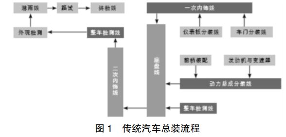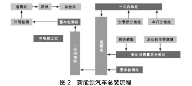 汽車總裝的含義是按照有關(guān)標準,將汽車的各個零部件進行合理的組裝和調(diào)配并最終形成完整汽車產(chǎn)品的過程。目前新能源汽車主要以純電動汽車為主,因此,本文的新能源汽車主要指純電動汽車。傳統(tǒng)汽車的總裝工藝主要包括裝配、檢測、路試、入庫、返修等環(huán)節(jié)。