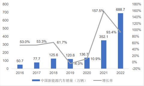中國是全球最大新能源汽車市場之一,受政府鼓勵和市場推動,我國新能源汽車市場在近幾年得到高速的發(fā)展。根據(jù)中國汽車工業(yè)協(xié)會數(shù)據(jù),2022 年,中國新能源汽車持續(xù)爆發(fā)式增長,銷量達到 688.7 萬輛,同比分別增長 93.4%,市場占有率達到 25.6%,逐步進入全面市場化拓展期,迎來新的發(fā)展和增長階段。