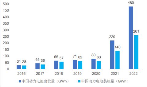 動力電池系新能源汽車的核心設備之一,直接影響新能源汽車的主要性能指標。根據(jù) GGII 數(shù)據(jù),2022 年中國動力電池出貨 480GWh,同比增長 118%;中國動力電池裝機量 261GWh,同比增長 86%。