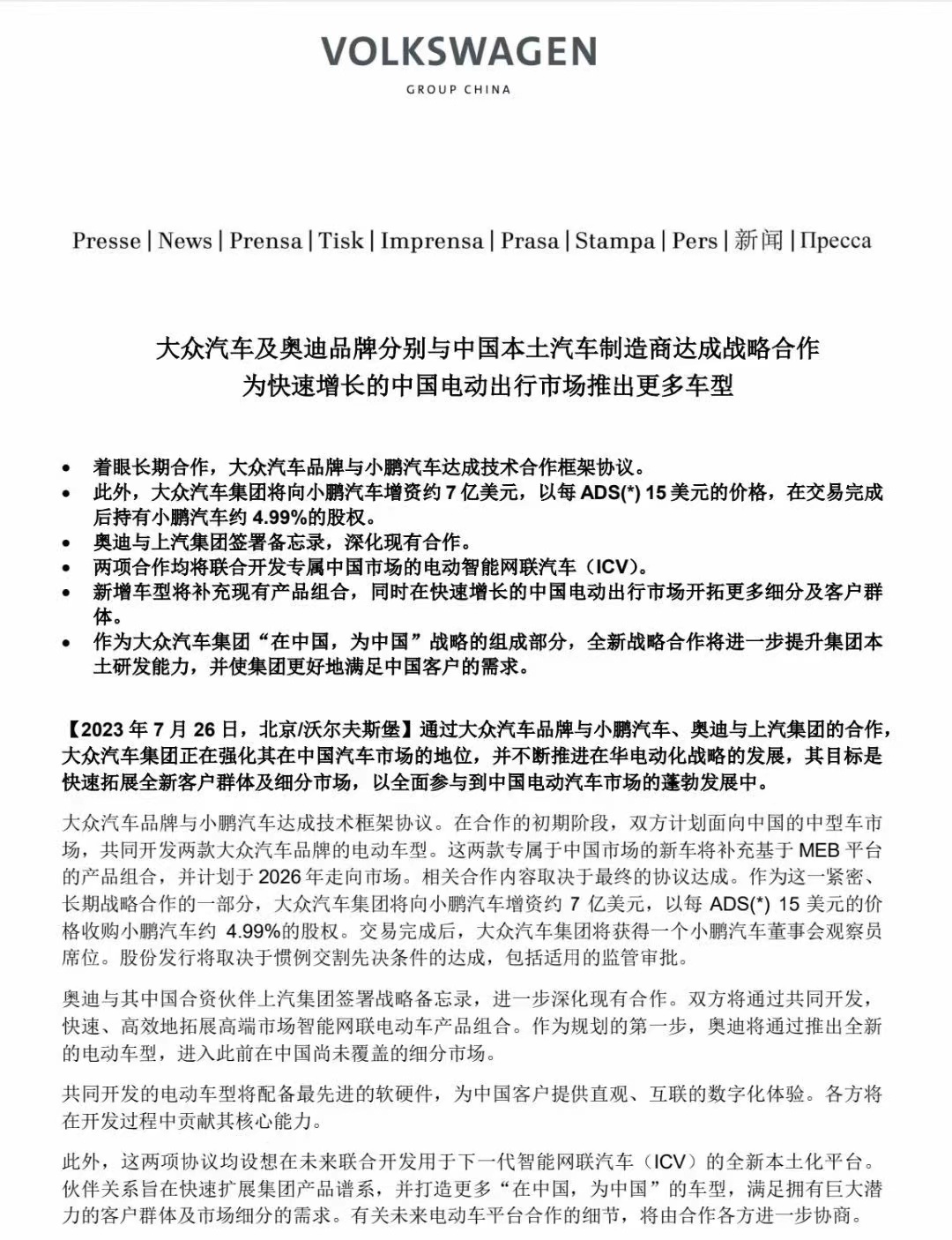 在新車“上市即熱銷”的同時(shí),小鵬還曝出了另一條讓所有人都出乎意料的“大新聞”——7月26日,該品牌與大眾汽車同時(shí)宣布:雙方已達(dá)成技術(shù)框架協(xié)議,將面向中國的中型車市場(chǎng),共同開發(fā)兩款大眾汽車品牌的電動(dòng)車型,并計(jì)劃于2026年推向市場(chǎng)。
