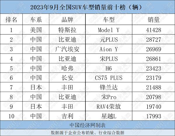 9月SUV:Model Y一馬當(dāng)先,比亞迪三車銷量超2萬(wàn)輛