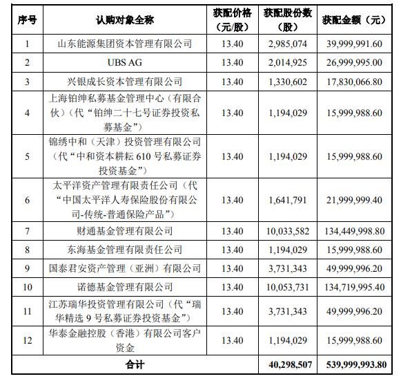 此外,財(cái)通基金管理有限公司、諾德基金管理有限公司、東海基金管理有限責(zé)任公司為證券投資基金管理公司,以其管理的資產(chǎn)管理計(jì)劃、公募基金產(chǎn)品或養(yǎng)老金產(chǎn)品參與認(rèn)購(gòu);太平洋(601099)資產(chǎn)管理有限責(zé)任公司為保險(xiǎn)機(jī)構(gòu)投資者;國(guó)泰君安(601211)資產(chǎn)管理(亞洲)有限公司、華泰金融控股(香港)有限公司、UBS AG屬于人民幣合格境外機(jī)構(gòu)投資者(QFII);山東能源集團(tuán)資本管理有限公司以自有資金或自籌資金參與本次發(fā)行認(rèn)購(gòu)。