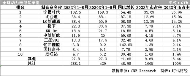 根據(jù)市場(chǎng)研究機(jī)構(gòu)SNE Research公布的全球動(dòng)力電池裝車數(shù)據(jù)。2023年1—8月,全球動(dòng)力電池裝車量為429GWH,同比增長(zhǎng)48.9%。中國六家電池企業(yè)入名前十,整體市占率63.1%,較去年同期的58.1%增加5個(gè)百分點(diǎn)。