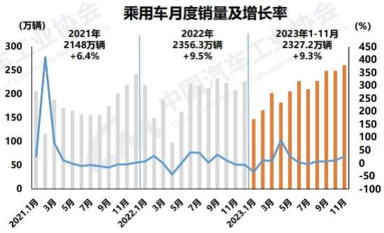 綜合1-11月,乘用車(chē)產(chǎn)銷(xiāo)分別完成2344.1萬(wàn)輛和2327.2萬(wàn)輛,同比分別增長(zhǎng)8%和9.3%。其中,乘用車(chē)國(guó)內(nèi)銷(xiāo)量為1955.2萬(wàn)輛,同比增長(zhǎng)2.7%;出口372萬(wàn)輛,同比增長(zhǎng)65.1%。