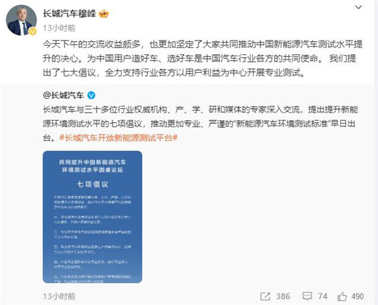 “今天下午的交流收益頗多,也更加堅定了大家共同推動中國新能源汽車測試水平提升的決心。為中國用戶造好車、選好車是中國汽車行業(yè)各方的共同使命。”12月14日,長城汽車總裁穆峰在其個人社交平臺表示,“我們提出了七大倡議,全力支持行業(yè)各方以用戶利益為中心開展專業(yè)測試。”