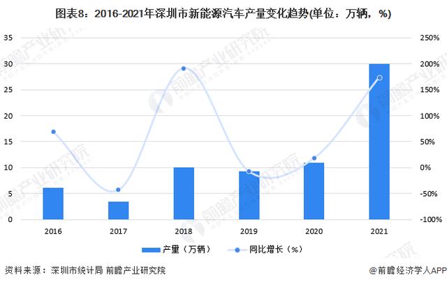 近年來(lái),深圳市新能源汽車產(chǎn)業(yè)發(fā)展迅猛。2018-2020年,深圳市新能源汽車產(chǎn)量維持在9萬(wàn)輛/年以上,2020年突破了10萬(wàn)輛;2021年,深圳市新能源汽車產(chǎn)量逼近30萬(wàn)輛,同比增長(zhǎng)174%;同時(shí),在新能源汽車的有效推廣下,全市公交出租均已實(shí)現(xiàn)電動(dòng)化,2021年全市新能源汽車銷量14.48萬(wàn)輛,占當(dāng)年汽車銷量比重超40%。