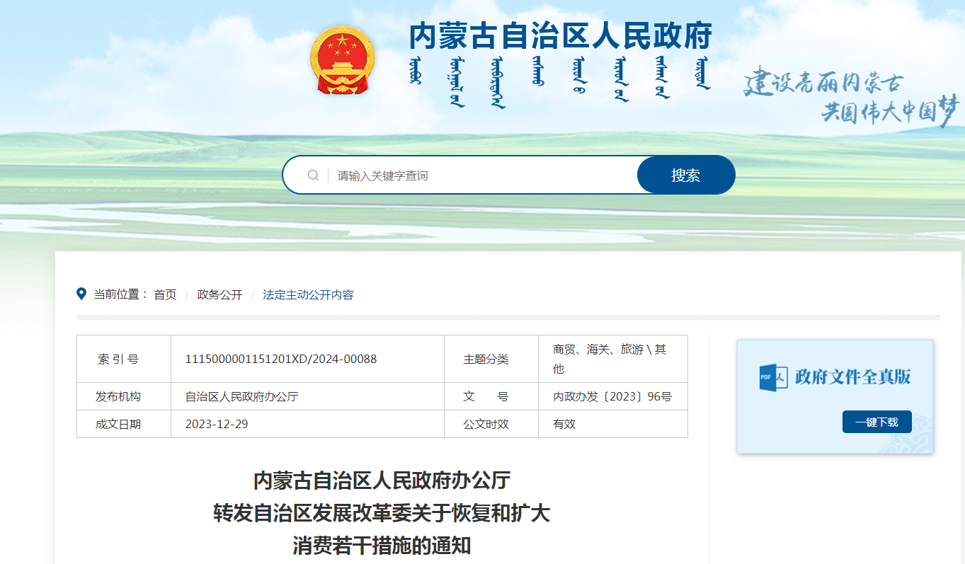 1月5日,內(nèi)蒙古自治區(qū)人民政府辦公廳轉(zhuǎn)發(fā)自治區(qū)發(fā)展改革委關(guān)于《恢復(fù)和擴(kuò)大消費(fèi)若干措施》的通知。其中提到: