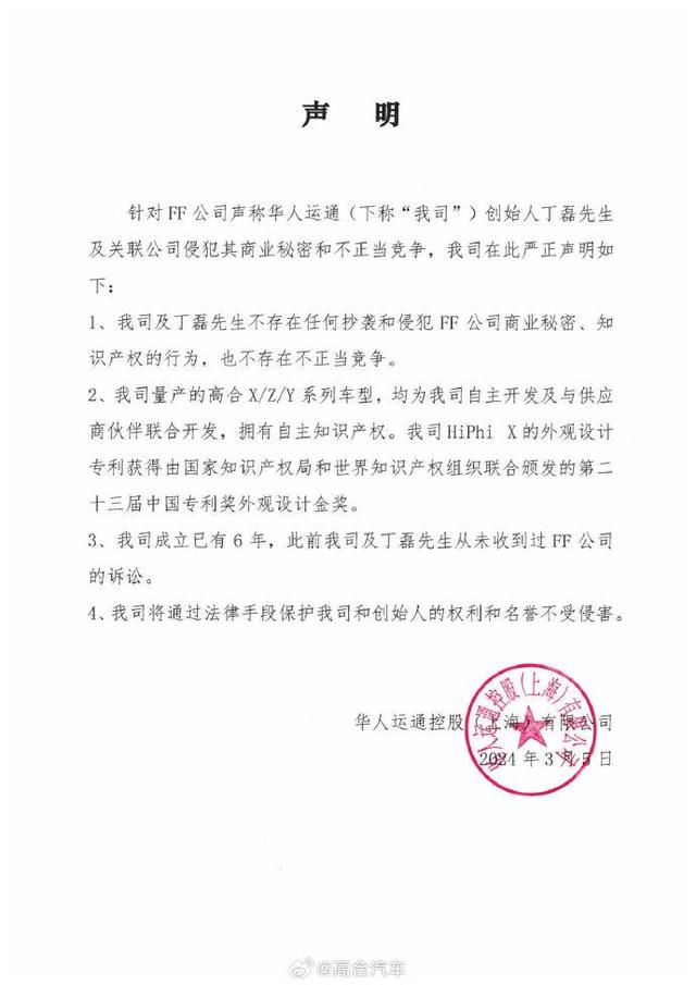 3月5日,就Faraday Future(法拉第未來,以下簡稱“FF汽車”)對華人運通高合汽車創(chuàng)始人丁磊及關聯(lián)公司的起訴,高合汽車方面發(fā)布聲明稱,該司及丁磊不存在任何抄襲和侵犯FF公司商業(yè)秘密、知識產(chǎn)權的行為,也不存在不正當競爭。