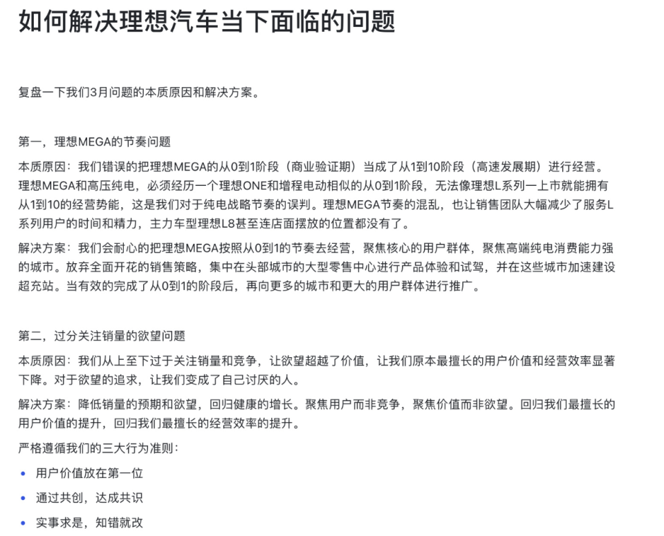 如何解決理想汽車當下面臨的問題?李想在全員內(nèi)部信里表示,復(fù)盤了理想3月問題的本質(zhì)原因和解決方案。