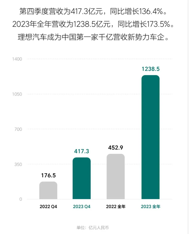財報顯示,理想汽車2023年全年實現(xiàn)營收1238.5億元,同比增長173.5%,為國內(nèi)首家營收突破千億元的新勢力車企。2023年凈利潤為118.1億元,而2022年凈虧損20.3億元,實現(xiàn)了自交付以來的全面盈利,成為繼特斯拉、比亞迪之后全球第三家實現(xiàn)盈利的新能源車企。其中,2023年四季度凈利潤為57.5億元,同比增長2068.2%。