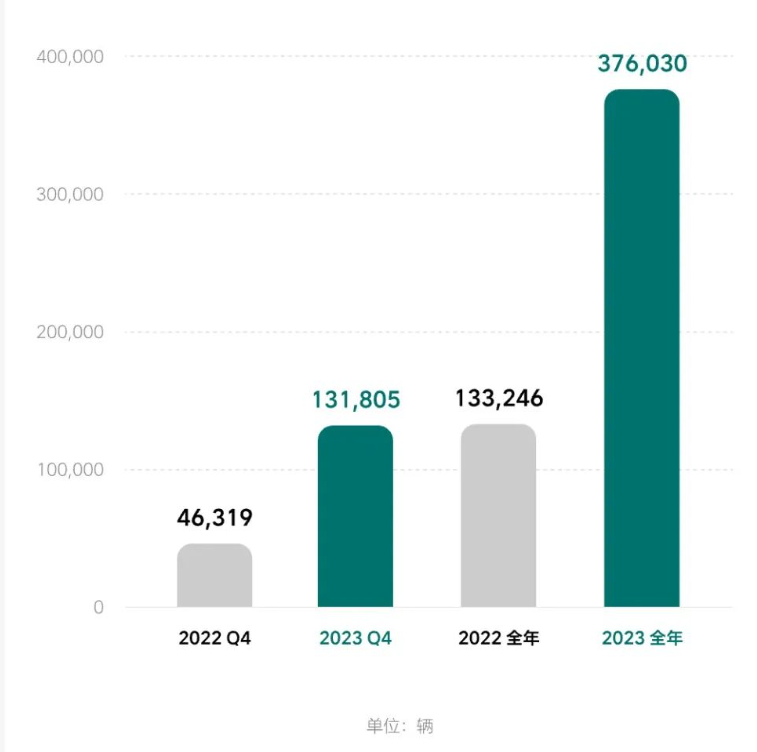 理想汽車扭虧為盈的背后是交付量的強勁增長。2023年,理想汽車交付新車37.6萬輛,同比增長182.2%,超額完成年度30萬輛的交付目標,奪得2023年新勢力“銷冠”。其中,四季度交付13.18萬輛,同比增長184.6%,超此前交付指引。