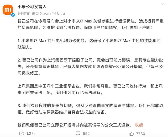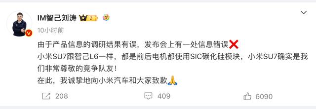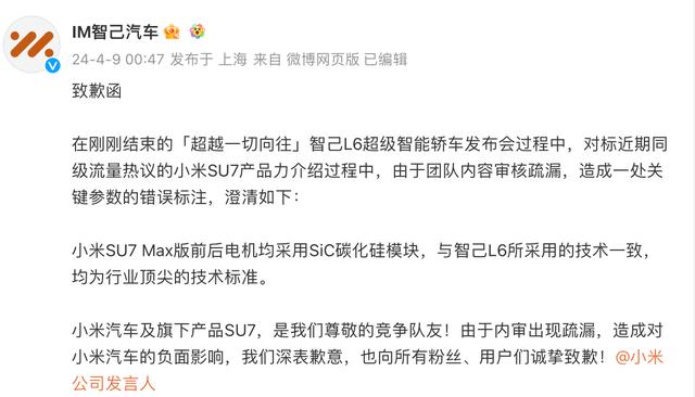 約半小時(shí)后,智己汽車終于在官方微博作出回應(yīng)稱,在剛剛結(jié)束的智己L6超級(jí)智能轎車發(fā)布會(huì)過程中,對(duì)標(biāo)近期同級(jí)流量熱議的小米SU7產(chǎn)品力介紹過程中,由于團(tuán)隊(duì)內(nèi)容審核疏漏,造成一處關(guān)鍵參數(shù)的錯(cuò)誤標(biāo)注,澄清如下:小米SU7 Max版前后電機(jī)均采用SIC碳化硅模塊,與智己L6所采用的技術(shù)一致,均為行業(yè)頂尖的技術(shù)標(biāo)準(zhǔn),“小米汽車及旗下產(chǎn)品SU7,是我們尊敬的競(jìng)爭(zhēng)隊(duì)友!由于內(nèi)審出現(xiàn)疏漏,造成對(duì)小米汽車的負(fù)面影響,我們深表歉意,也向所有粉絲、用戶們誠摯致歉!”