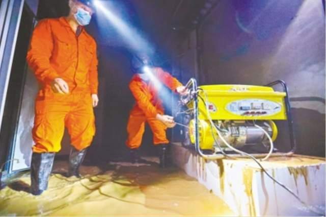 搶修人員在天倫灣小區(qū)進(jìn)行抽水、烘干設(shè)備等系列搶修