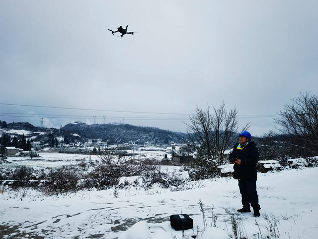 雪鵝毛般下得很大,一路上車很少,鄭鋒將車提前裝好防滑鏈后一直保持不超過30碼的車速小心行駛,到達110千伏黃牽線40號塔附近,室外氣溫已達-5度,迎著刮臉刺骨的風(fēng),4人向塔所在的山腰挺進。一時間雪下小了,短暫的“空窗期”給了他們飛無人機的絕佳機會。