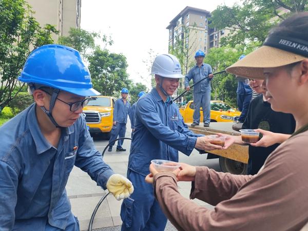6月22日,桂林市萬達翰林府小區(qū)群眾為正在開展搶修復電的南方電網廣西欽州靈山供電局黨員突擊隊員們送上綠豆湯。陳心誠攝