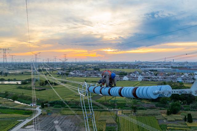 圖為該工程竣工前夕,電力建設(shè)工人正在進(jìn)行最后的附件安裝工作。