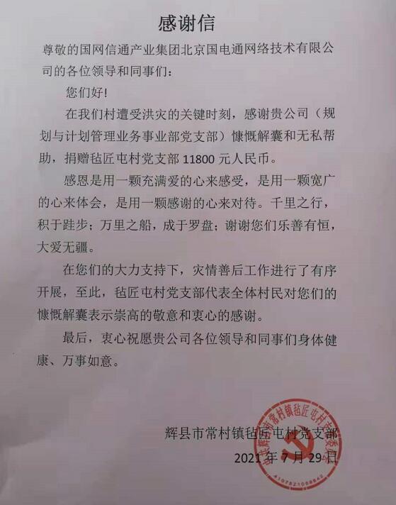 中國電力網(wǎng)訊 (通訊員 朱友宇) “在您們的大力支持下,災(zāi)情善后工作進行了有序開展,至此,氈匠屯村黨支部代表全體村民對您們的慷慨解囊表示崇高的敬意和衷心的感謝”,輝縣市常村鎮(zhèn)氈匠屯村黨支部在感謝信中寫道。7月29日,國網(wǎng)信通產(chǎn)業(yè)集團國電通規(guī)劃與計劃管理業(yè)務(wù)事業(yè)部黨支部收到了一封特殊的感謝信,這封信不是來自用戶的,也不是來自上級單位的,它來自輝縣市常村鎮(zhèn)氈匠屯村黨支部。