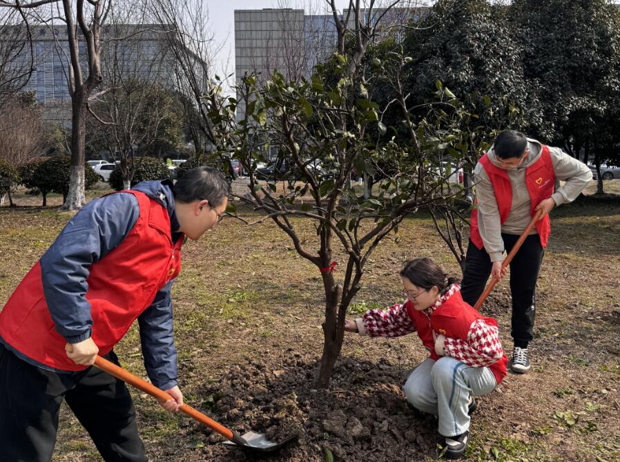 隨后,三方黨支部號召黨員、團(tuán)員共同踐行“綠水青山就是金山銀山”理念,開展“共植黨員林”植樹活動。身穿紅色馬甲的黨員、團(tuán)員們彼此團(tuán)結(jié)協(xié)作、緊密配合,有條不紊的進(jìn)行著揮楸鏟土、扶苗填坑、提桶澆水等各環(huán)節(jié)作業(yè)。經(jīng)過大家的共同努力,三個黨支部一起種下的“共建樹”在土地上挺立著,“黨建紅”與“生態(tài)綠”交相輝映,呈現(xiàn)出春意盎然、生機(jī)勃勃的景象。