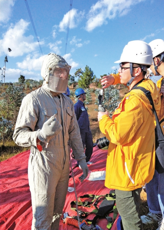 在±800千伏楚穗直流線路2號塔,當超高壓公司昆明局輸電管理所帶電班班長張曉輝向大家展示他的特高壓帶電作業(yè)屏蔽服時,武漢大學大四學生喬曉亮忍不住試穿了一把。穿上屏蔽服,開始喬曉亮覺得新鮮,但沿著高壓線路在地面走了不到十分鐘,額頭上立即冒出汗珠,“當架空輸電線路上出現(xiàn)故障時,帶電作業(yè)人員就需要穿著這樣的服裝背著三四十斤的工具,走在70多米的高塔上帶電作業(yè),聽起來不可思議,但這就是南網(wǎng)員工的日常。”喬曉亮說。