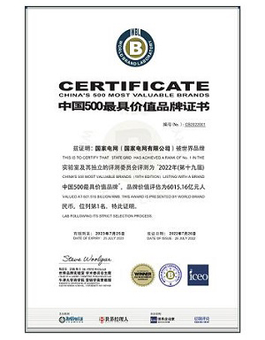 “2022年(第十九屆)中國(guó)500最具價(jià)值品牌”證書
