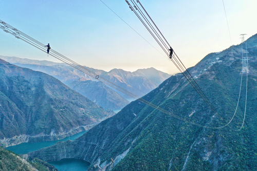 國網(wǎng)四川電力員工在白鶴灘—浙江特高壓工程施工現(xiàn)場(chǎng)展放導(dǎo)線。