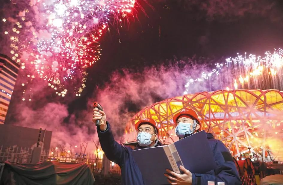 北京冬奧會(huì)閉幕式期間,國網(wǎng)北京電力冬奧保障人員在國家體育場(chǎng)附近巡檢供電設(shè)備。翟磊 攝