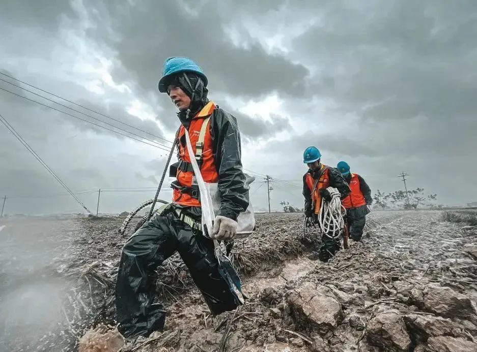 臺(tái)風(fēng)“梅花”在浙江舟山普陀沿海登陸后,國網(wǎng)浙江電力員工穿過泥濘的田地前往故障點(diǎn)開展搶修。程夢(mèng)玨 攝