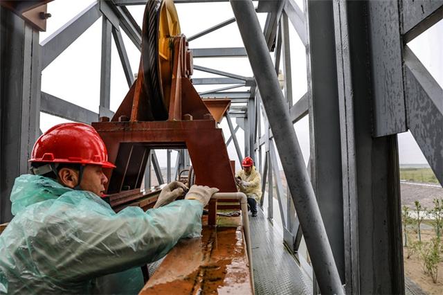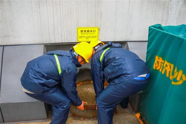 國網江蘇南通供電公司員工冒雨檢查閘口用電設備,確保安全運行。