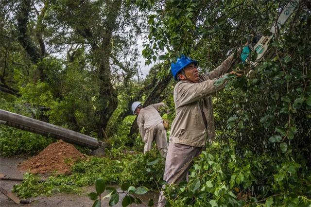 國網福建泉州惠安供電公司員工在被大風壓斷的10千伏虎窟線電桿旁緊急清理樹木障礙。