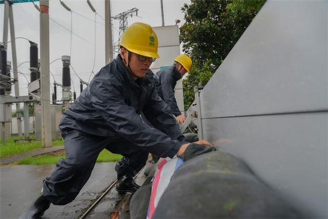 國網安徽安慶岳西縣供電公司員工裝沙袋加固城西變電站圍墻,防范臺風影響變電站設備安全運行。