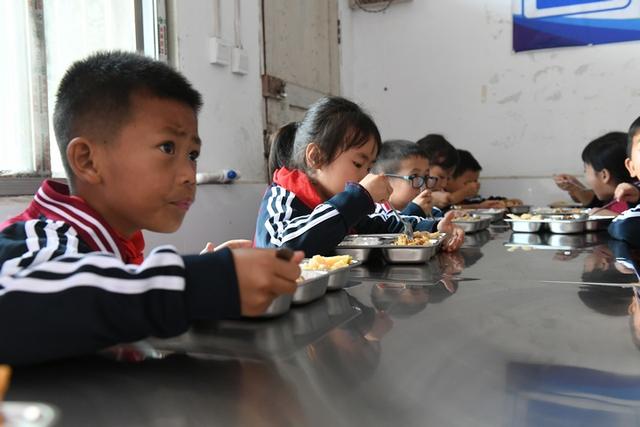 洛麥小學(xué)學(xué)生用捐贈(zèng)的餐盤(pán)吃飯。龍定錦攝