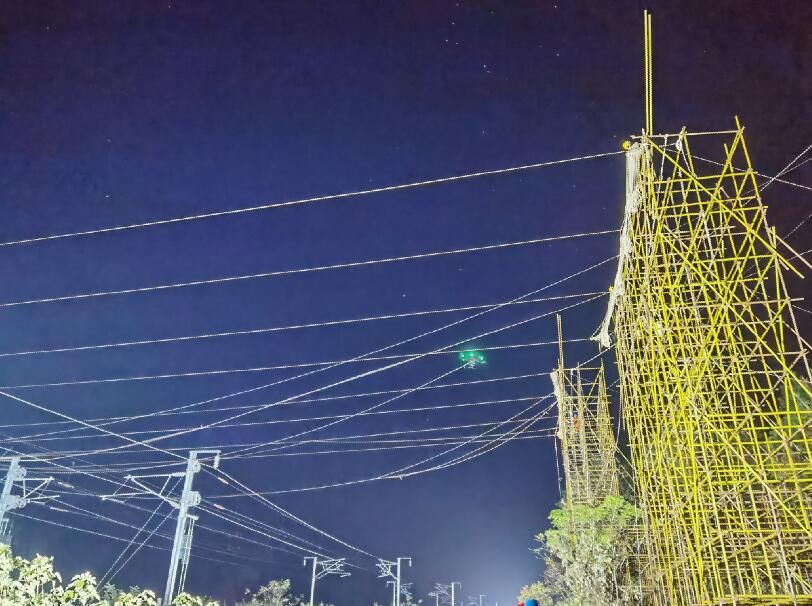 當(dāng)晚0時(shí)0分,六旋翼無人機(jī)從武西高鐵南側(cè)起飛,牽引著迪尼瑪繩向北側(cè)飛去,地面作業(yè)人員順著無人機(jī)的牽拉力量緩緩放繩。鐵路軌道處監(jiān)護(hù)人員密切觀測(cè)著各級(jí)引繩與跨越架之間的距離,通過對(duì)講機(jī)通知牽張場(chǎng)及時(shí)調(diào)整牽張力,確保架線施工順利進(jìn)行。